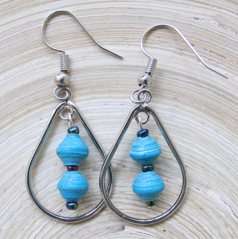 Unique one of a kind small oval hoop earring with twp small soft blue paper beads in the center of the hoop. Fair trade. Paper beads made by Ugandan women. Nickel free.